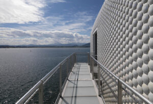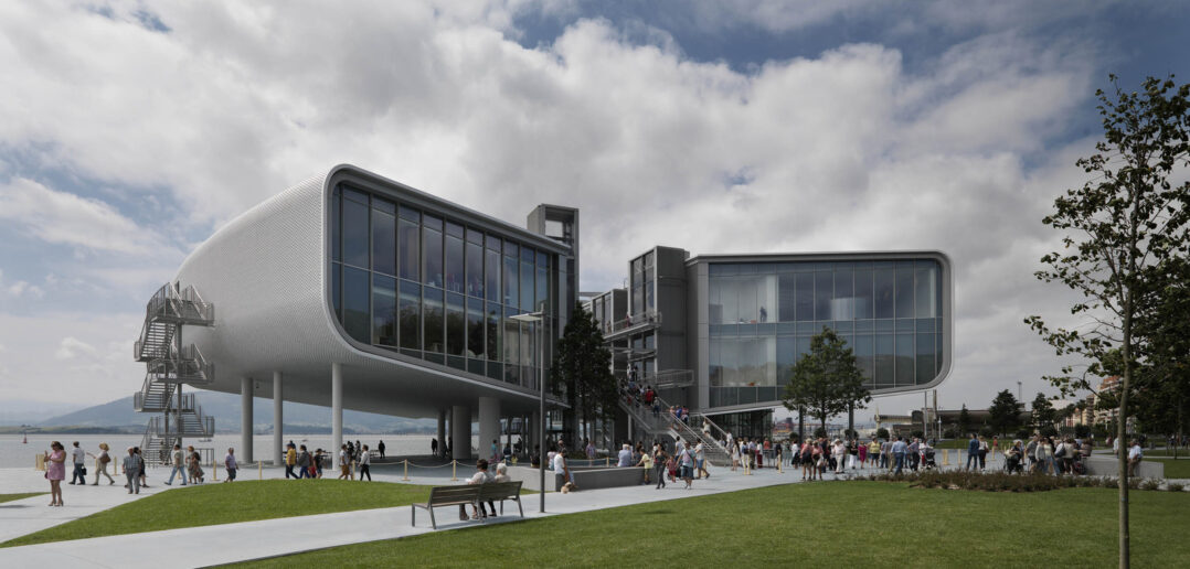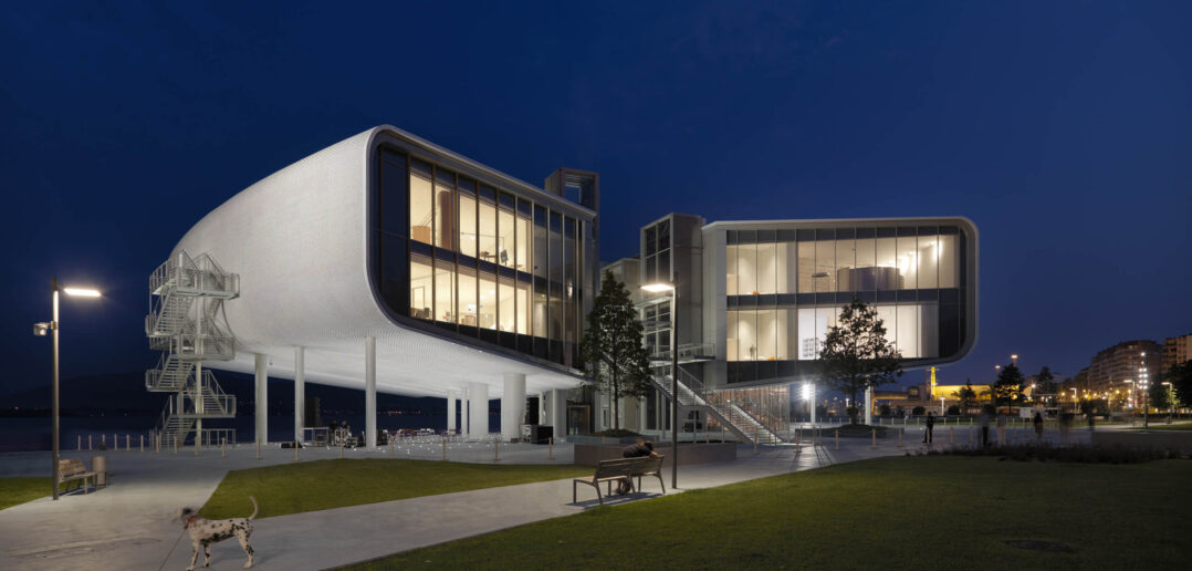La forma orgánica de sus dos volúmenes —resultado de un proceso de diseño refinado a través de maquetas— busca acompañar las vistas y potenciar la entrada de luz natural. La envolvente, compuesta por más de 280.000 piezas cerámicas de tono nacarado, refleja el cielo, el agua y la atmósfera cambiante de Cantabria, otorgándole al edificio una presencia vibrante y ligera.