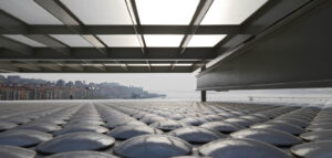 El edificio se implanta entre el verde y el agua con una decisión clave: minimizar su impacto visual. Para lograrlo, el Centro Botín se divide en dos volúmenes elevados, apoyados parcialmente sobre pilotes en el mar. Esta solución no solo preserva las visuales desde el parque, sino que también genera una nueva espacialidad pública. Entre ambos cuerpos, una serie de pasarelas livianas de acero y vidrio conforman una plaza elevada que actúa como mirador y punto de encuentro.