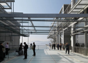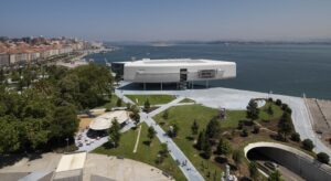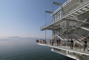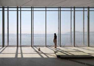 El conjunto se completa con un anfiteatro al aire libre integrado al parque, cuya fachada funciona como pantalla para cine y eventos. En planta baja, un espacio transparente alberga cafetería, restaurante y áreas de uso público, diluyendo los límites entre interior y exterior. El pavimento continuo y los amplios aleros refuerzan esta idea de continuidad, enmarcando vistas abiertas hacia el mar.