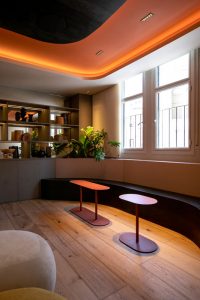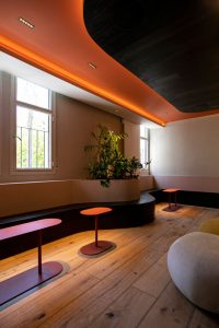 El mobiliario queda completo con el aporte de la gente de Números Primos, teniendo unas mesas de chapa en un color complementario al ambiente en material de chapa junto a una serie de Pufs de Pat Lascano que arman un sector de estar más bajo y relajado.
