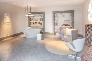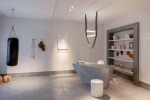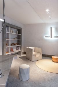 Es un espacio monocromático en la gama de los tonos crudos y con el porcellanato como material principal.