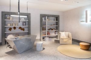 Las bibliotecas del espacio tienen porticos hechos con porcellanato Rocca Grey Out de Vite Porcellanato. Mientras que el sillón fue realizado en Antico Ivory.