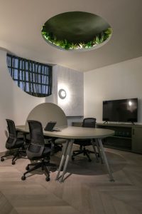 Un ducto ubicado a lo largo de uno de los laterales del espacio combina un phonebooth doble, un puesto individual y un asiento para dos personas. Este ducto contiene todas las soluciones de conectividad necesarias.