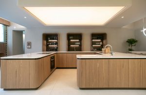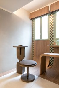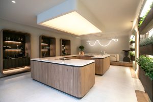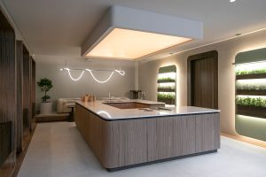 Rodeando la isla central, en los dos extremos de cabeceras, la propuesta es ofrecer diferentes opciones de asiento y apoyo, variaciones en los niveles y las prestaciones acordes a una convivencia múltiple en experiencias.