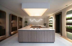 La luz solar se aprovecha en su totalidad. Con un criterio de consumo consciente y respetuoso de los ciclos biológicos, el sistema inteligente regula el uso de la energía. La iluminación se va adaptando a los distintos momentos del día y las necesidades de sus habitantes. Al momento de cocinar y compartir, la isla se vuelve protagonista con una claridad blanca neutra e intensa. En los tiempos de descanso, un matiz más tenue y cálido, adaptándose al horario nocturno en donde se enciende el sector vegetal.