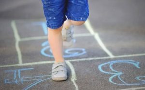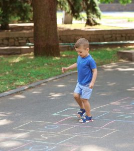 Uno de los grandes clásicos es la rayuela, donde lo único que hace falta son tizas de colores (y permiso para pintar el suelo) para crear la mítica cuadrícula. Se dibuja un diagrama de 10 cuadrados y se rellenan del 1 al 10. El niño se debe colocar al principio de la primera caja, sin tocar las líneas y tirar una piedra al diagrama. El juego comienza cuando el niño llega a tomar la piedra saltando y pasándola de número en número.