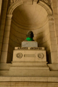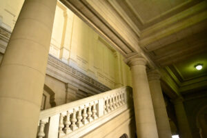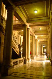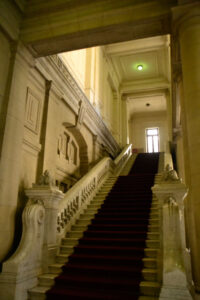 El claustro de planta baja Bolívar conduce a derecha e izquierda a dos escaleras de honor de mármol blanco con alfombras rojas, simétricas, que suben al primer piso.
